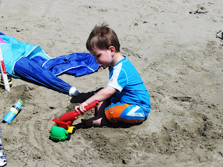 The first week of June we packed up the car and headed to the beach, so that Rick could surf. We had a fun filled trip, the kids enjoyed playing in the sand while daddy surfed the waves. Our friends the Taylor's were at the beach as well, so Bryce was Rick's surfing buddy. Right after we arrived and unloaded our car we headed strait to the beach. It was pretty windy but we had a good time.